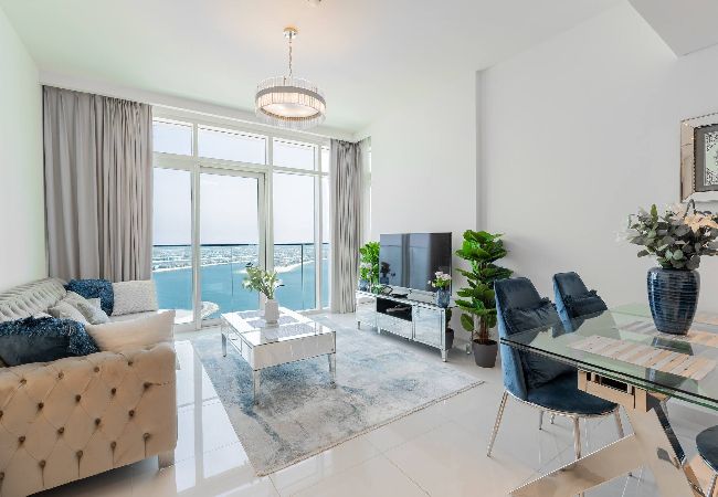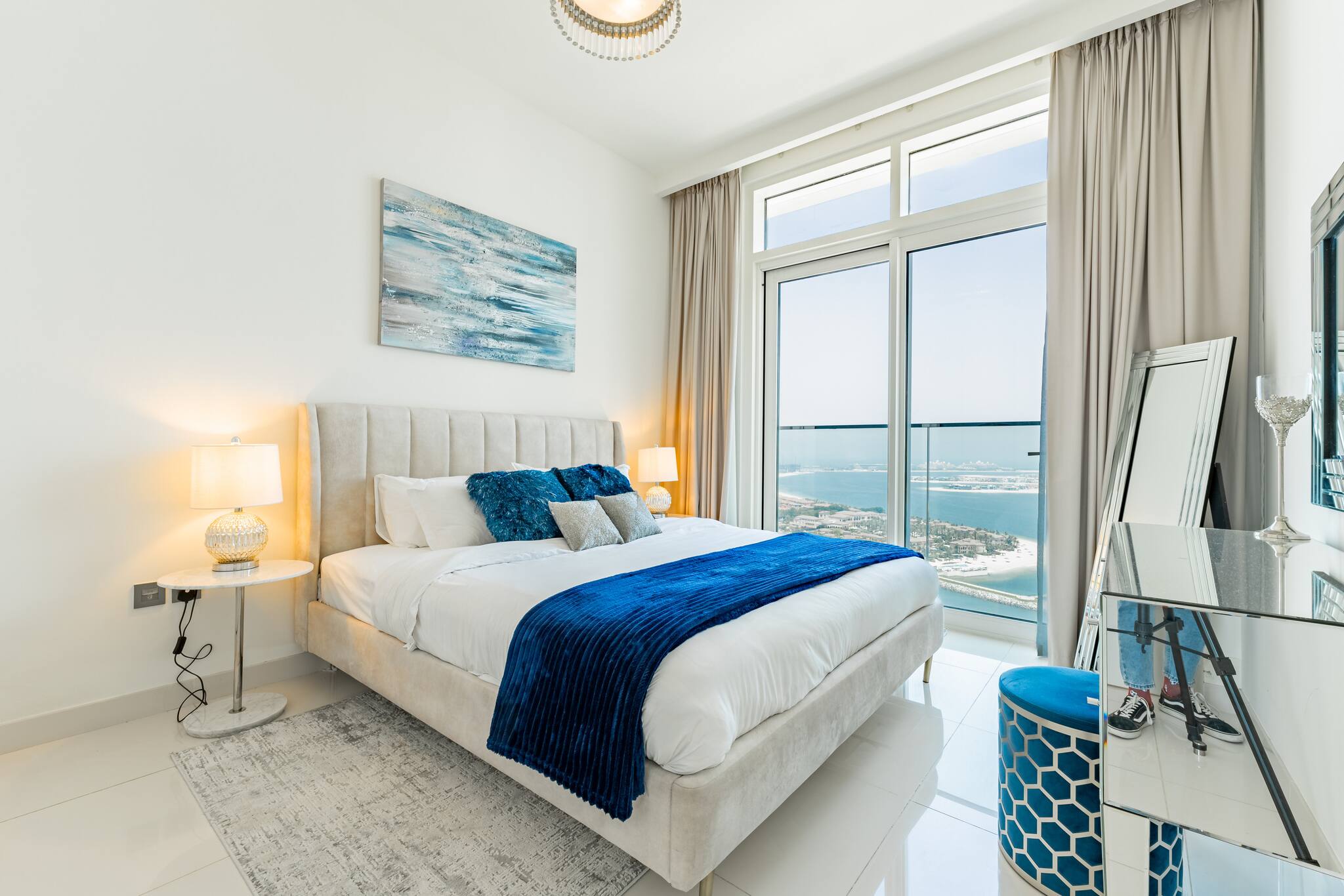 Experience luxury living in this modern 1BR apartment in Sunrise Bay. Enjoy sweeping sea and Palm Jumeirah views from the balcony, a cozy bedroom, stylish living area, and a fully equipped kitchen. Guests get access to a private beach, pool, gym, and parking. Perfect for a relaxing getaway, long stays, or business trips in Dubai Marina.